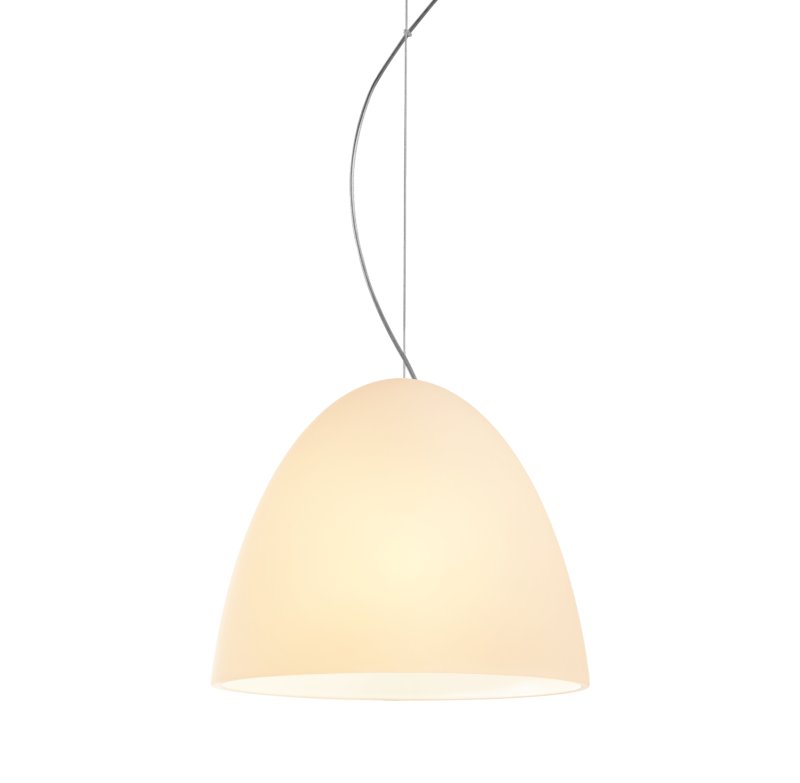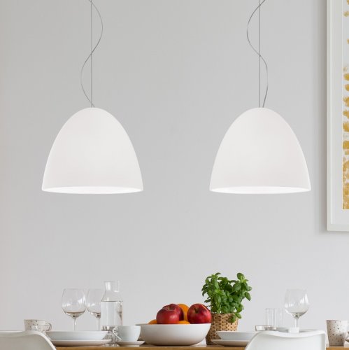 Die klassische Glockenform der BELL Pendelleuchten besticht durch zeitlose Eleganz und wohnlichen Charakter. Dazu trägt neben der Form auch das sanfte Licht bei, das durch den dickwandigen hochwertigen Glasschirm scheint. Ein ganz besonderer Effekt garantiert die Variante in weiß-sand-weiß: Diese Variante ist im Dreischicht-Verfahren hergestellt, zwischen der weißen Schichten außen und innen ist eine Schicht sandfarbenes Glas „gefangen“. Im ausgeschaltetem Zustand ist die Leuchte weiß, erst beim Einschalten des Lichts kommt das sandfarbene Innere zum Vorschein und erzeugt ein warmes angenehmes Licht. Die Aufhängung erlaubt die dezentrale Montage der Leuchtenschirme getrennt vom Stromauslass. Durch Zubehör wie größere Baldachine, Zugppendel zur Höhenverstellung oder längere Drähte / Kabel lässt sich BELL wie alle anderen Casablanca Pendelleuchten individualisieren und für jede Montageart anpassen.