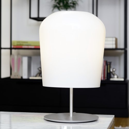 SYSS besticht durch hochwertiges doppelschichtiges mundgeblasenes Glas: Die äußere Schicht ist klares Kristallglas und die innere Schicht weißes Glas. Dadurch erhält SYSS eine besondere Optik und Glasdicke was wiederum für ein diffuses entblendetes Licht sorgt. Trotz des dickwandigen soliden Glases steht die SYSS Tischleuchte stets stabil, dafür sorgt der massive Tischleuchtenfuß. Die Armatur ist aus Aluminium gefertigt und die Oberfläche wurde manuell handgebürstet, was das Material Aluminium besonders betont. Die Zuleitung der SYSS Tischleuchte ist transparent und mit einem Schalter oder alternativ als Option mit Handdimmer verfügbar.