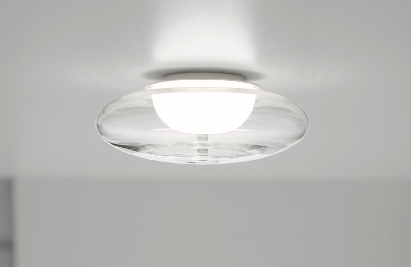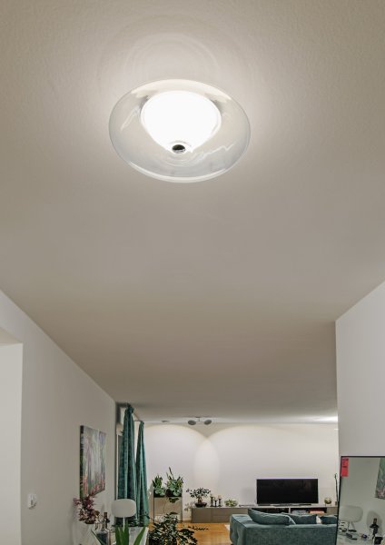 The harmonious symbiosis of clear crystal glass and white opal glass of the BLOO ceiling lamp creates a bright but soft and glare-free light. Both glasses are hand-blown and extremely high quality in feel and look. The fitting is made of aluminum and powder coated white matte. The CNC-turned aluminum cover, which is visible from below, is hand-polished to a shine, harmonizing perfectly with the crystal glass. Inside behind the white opal glass hemisphere is a powerful LED which can be replaced. The BLOO ceiling lamp is dimmable by suitable LED dimmer, our dimmer recommendations are dimmers of the brand VADSBO. With a diameter of ø 30 cm and a light output of about 1,500 lumens (equivalent to about a former 100W bulb), the BLOO ceiling light is ideal for living rooms up to 15 square meters, as well as bathrooms and entrance areas.