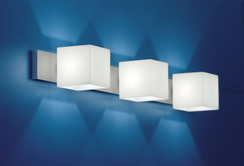 The multi version in which several of the glass cubes are attached to an elongated hand-brushed aluminum canopy is the perfect lighting for mirrors of all kinds, whether in bathrooms and dressing rooms. In the CUBE wall lights G9 plug-in sockets are used, thereby there is free choice of G9 bulb and easy interchangeability!